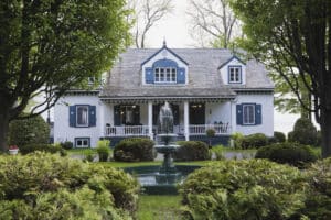 You are here: Home / Home Inspections / Home Inspection Cost / White with blue trim 1920s cottage style house facade with water fountain, Quebec, Canada
